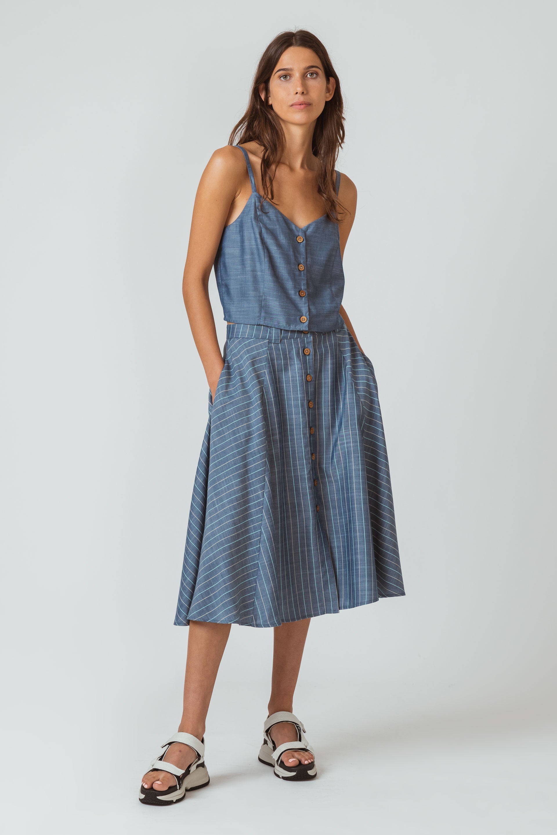 Small fitted camisole with thin straps, V-neck and button closure, in fresh TENCEL™ Lyocell imitating denim.