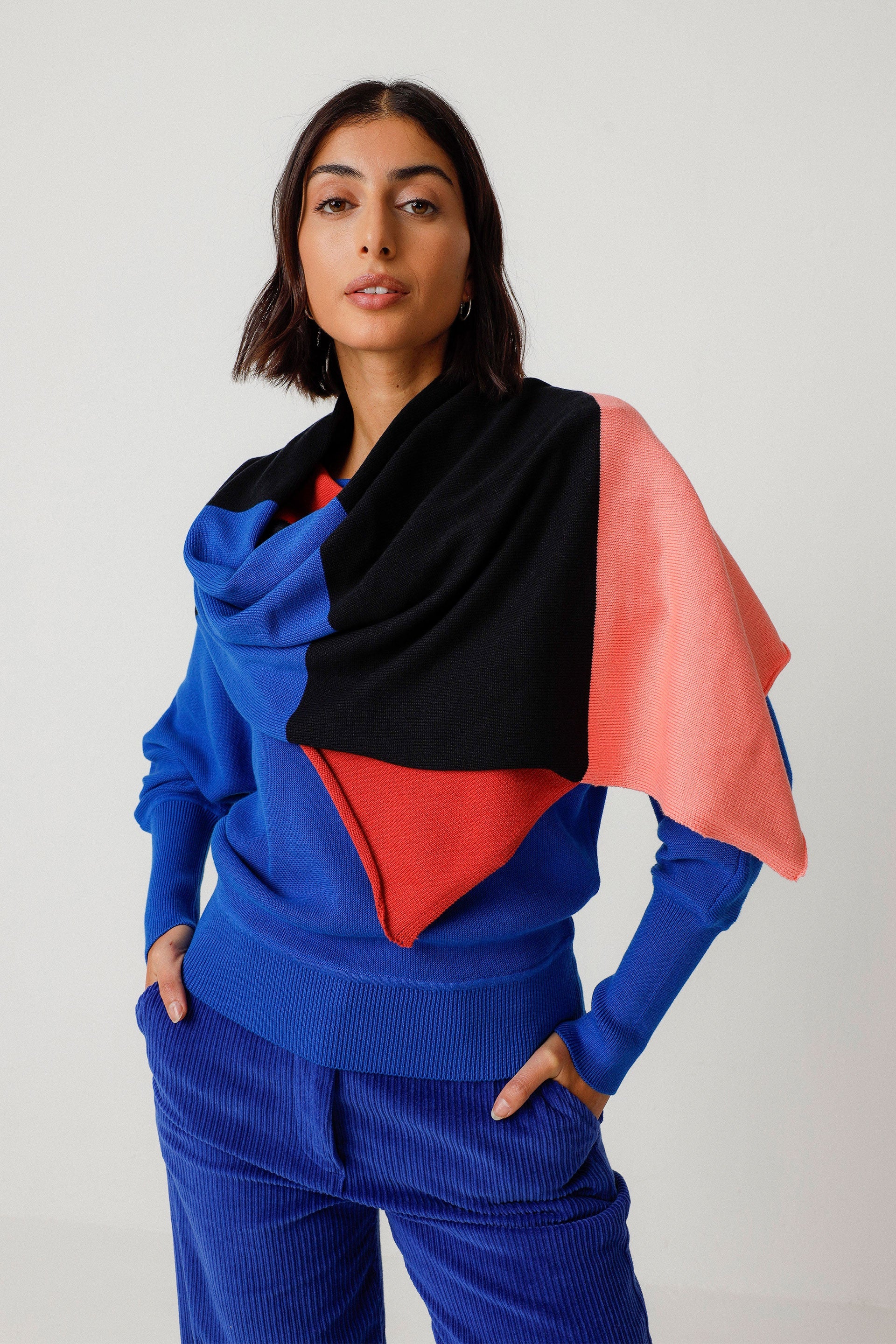 Multicolor rectangular knit scarf. Add a unique touch to your look. Certified organic GOTS cotton.