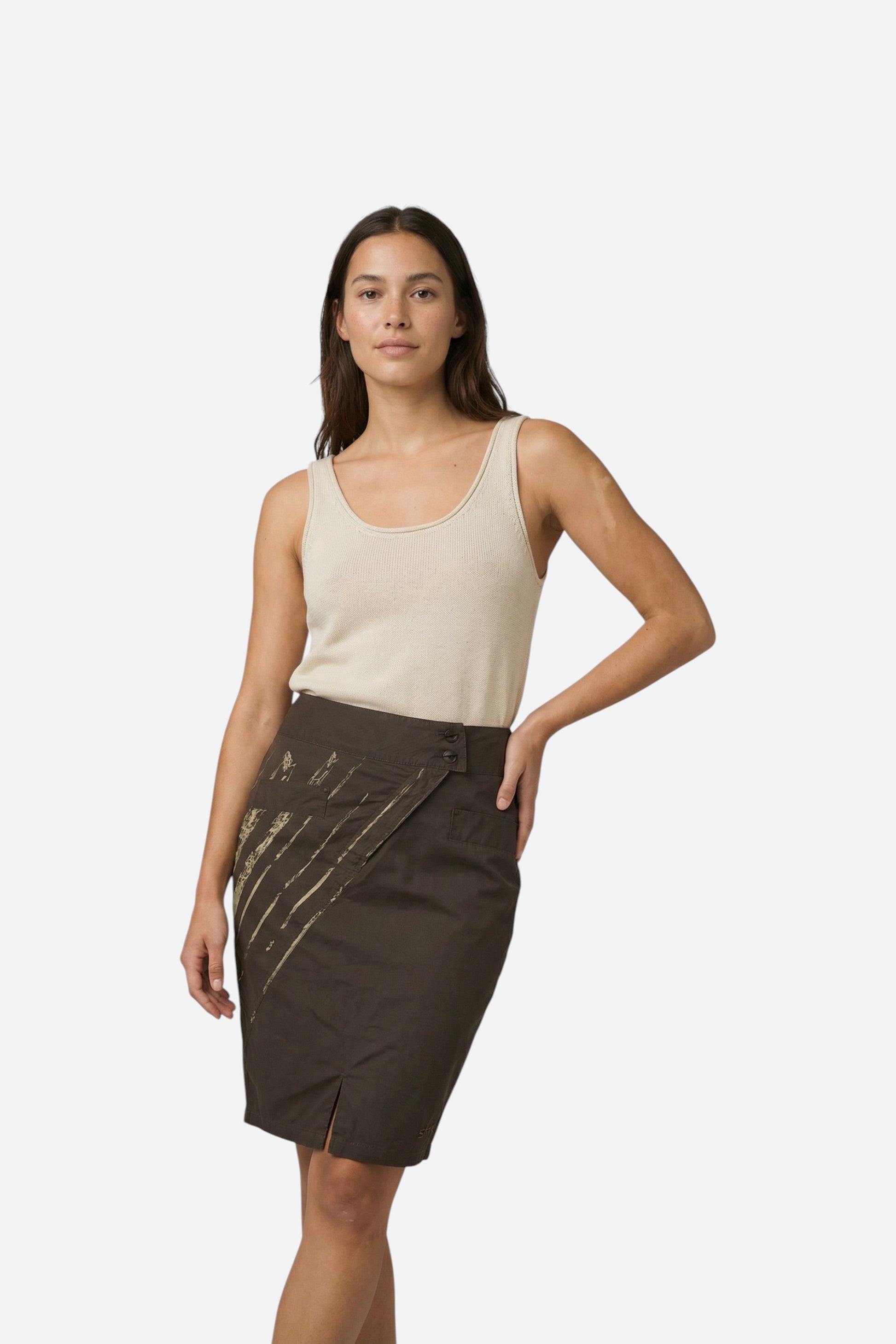 Falda Agurtzane, cierre delantero con 2 botones y cremallera diagonal. Tiene una abertura en el lateral, 2 bolsillos delanteros y uno trasero. Tiene fruncido con elástico en la espalda, se ajusta muy bien, ajusta glúteos y parte inferior del cuerpo con un efecto espectacular. Ya no lo uso porque mi talla ha aumentado.