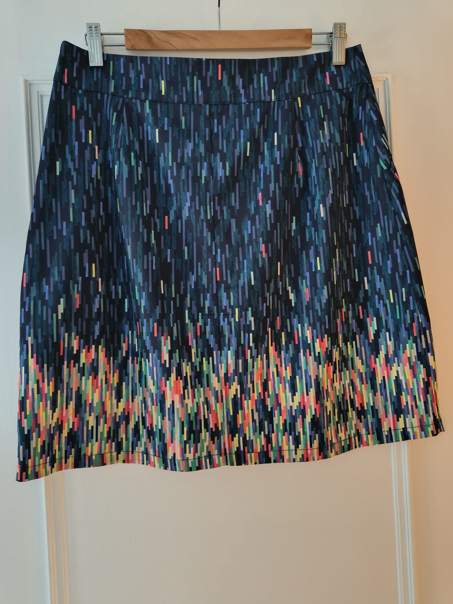 Poco uso, en perfecto estado. Esta falda corta, por encima de la rodilla, es muy cómoda. Es ajustada a la cintura, tiene dos bolsillos laterales y se cierra con cremallera. El estampado es precioso. Es de la marca SKFK (Skunkfunk). Talla 3 (aprox. 38).