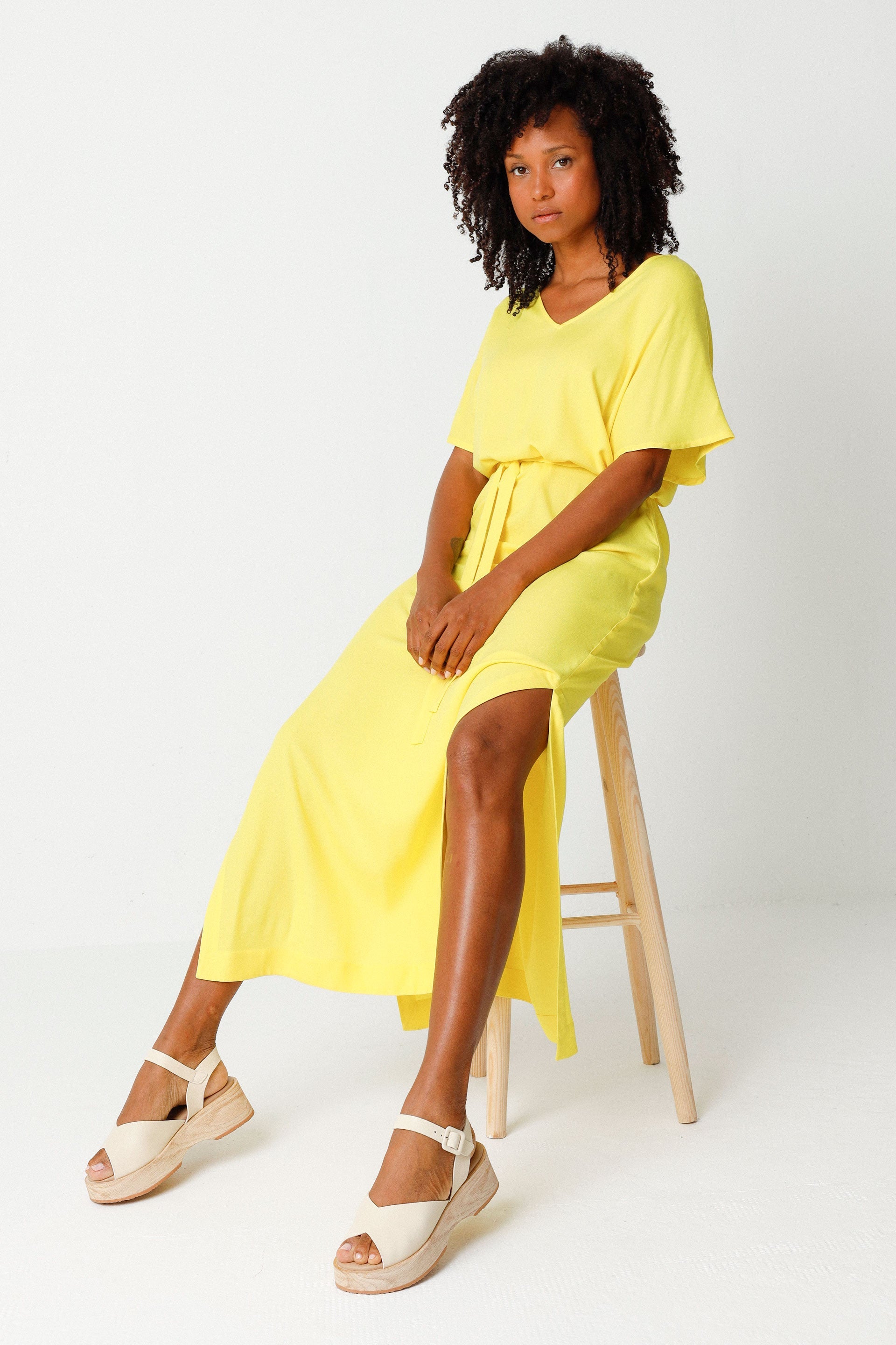 Vestido largo y holgado de material ligero. Este modelo presenta mangas cortas y escote en pico, además de amplias aberturas laterales. AMARILLO.