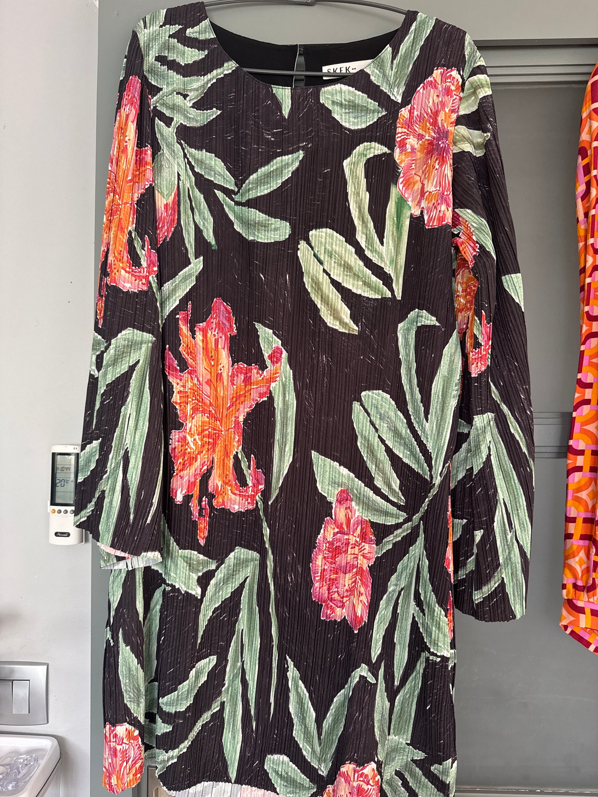 Minivestido recto con cuello redondo, mangas largas abullonadas y un corte decorativo en la espalda. Estampado floral.