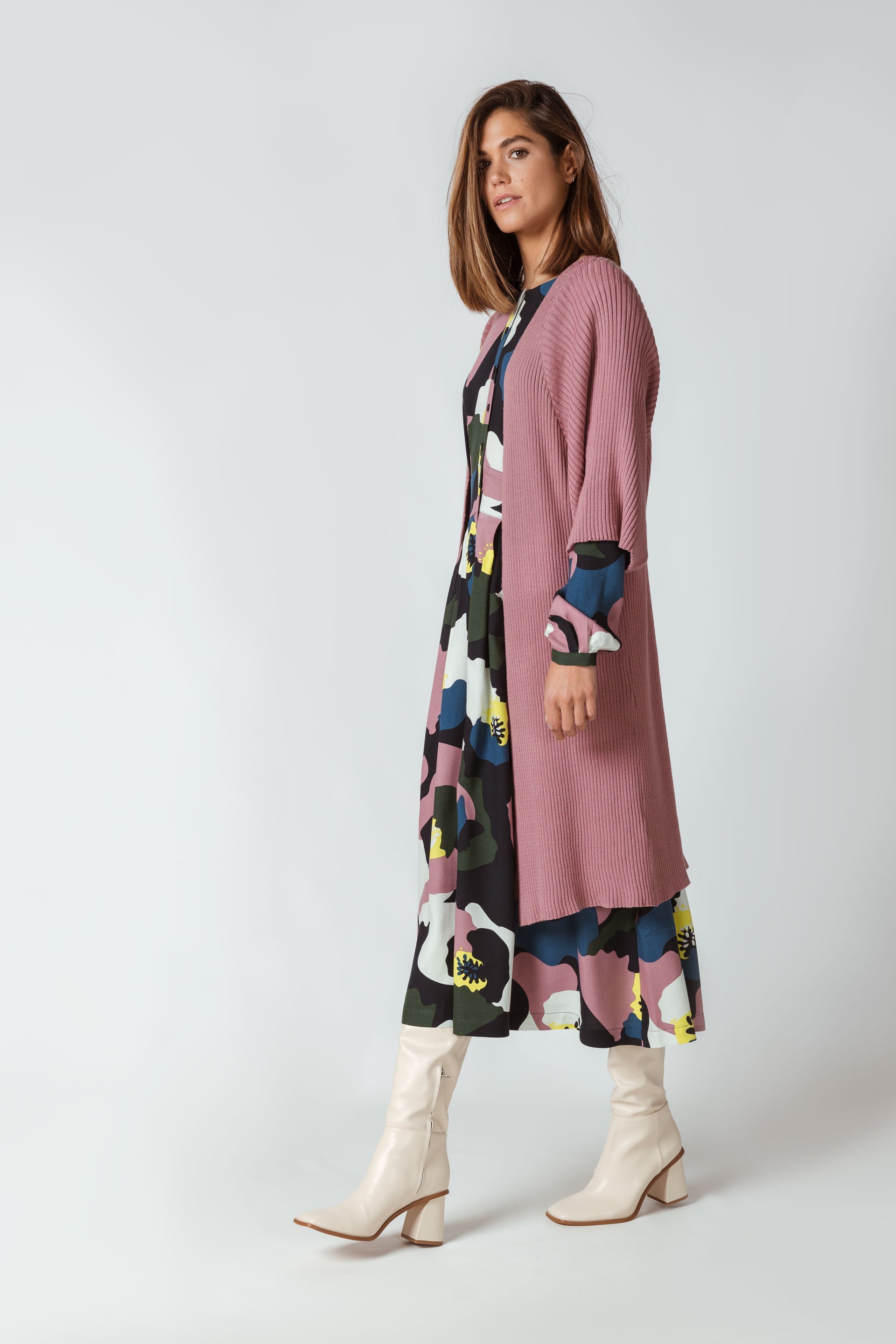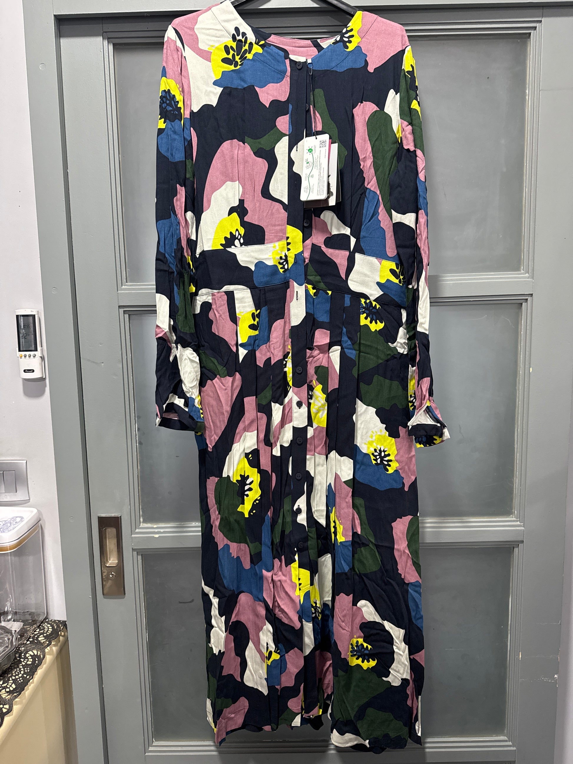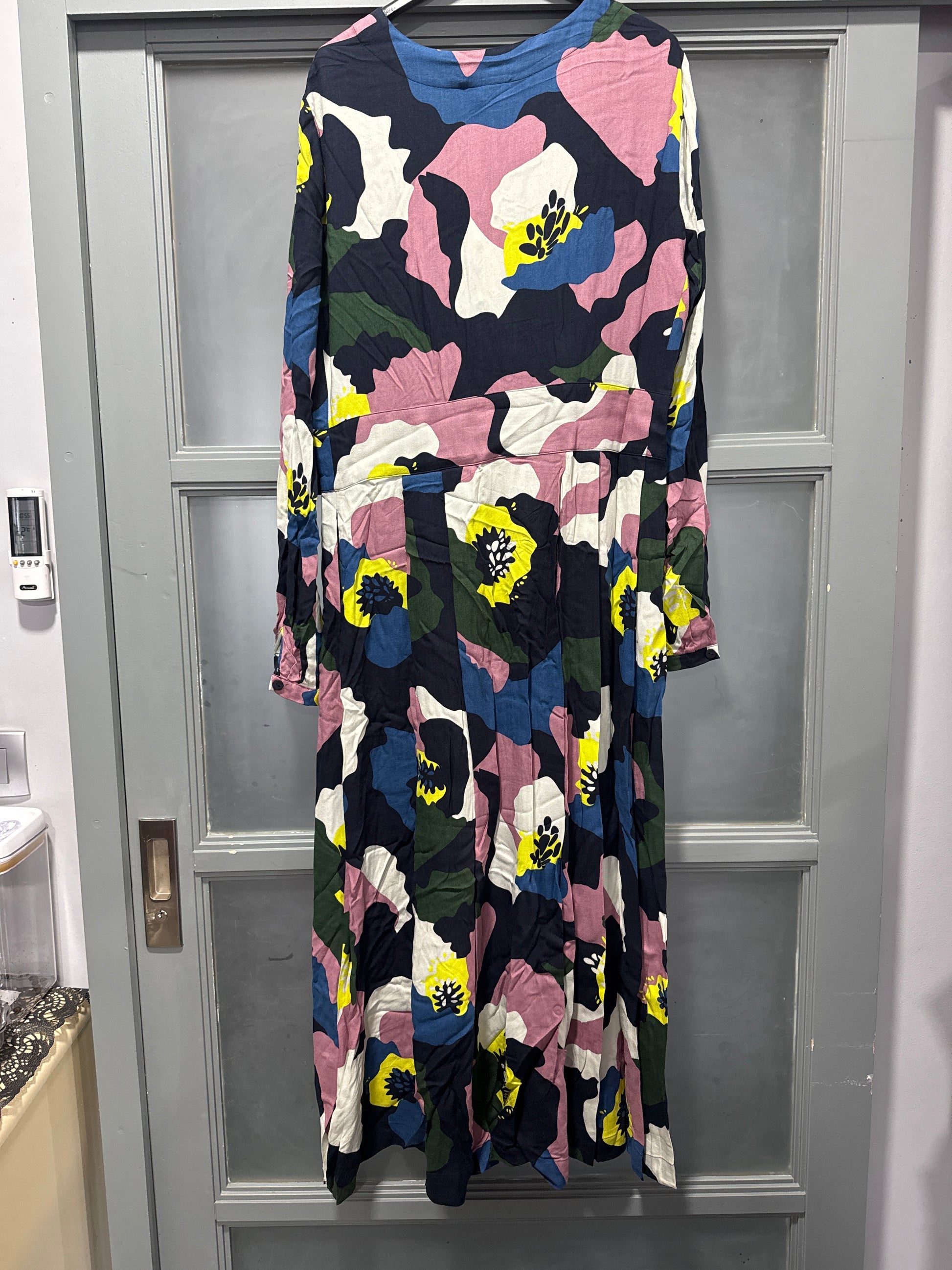 Vestido evasé de largo tres cuartos con cuello redondo, botones en la parte delantera y bolsillos laterales. Estampado floral maxi de pétalos en beige.