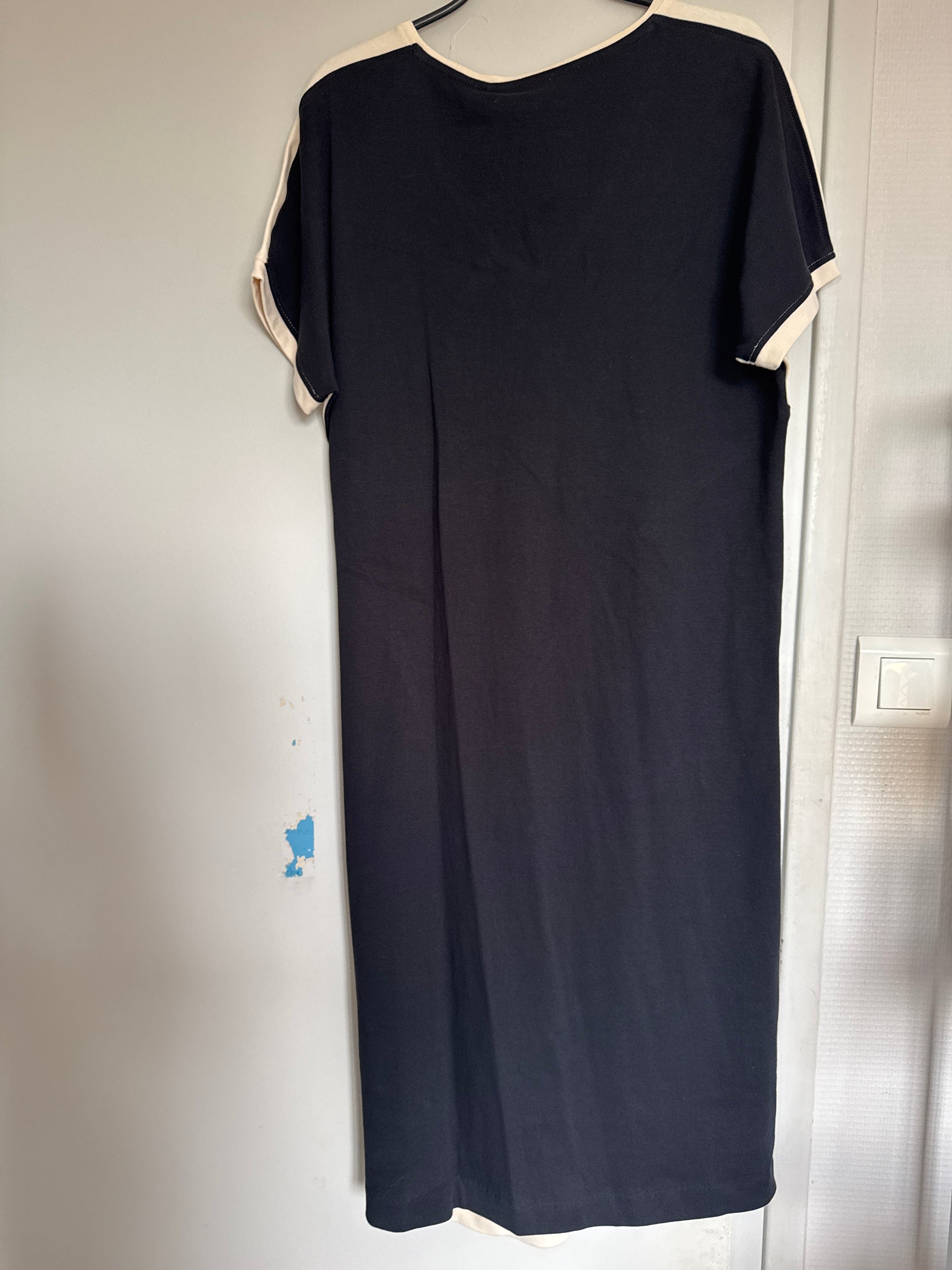 Vestido de manga corta de algodón orgánico con certificación GOTS, con cremallera decorativa en la parte delantera y colores en contraste. Corte recto por debajo de la rodilla y escote en pico. Crema y negro. Hecho en INDIA.