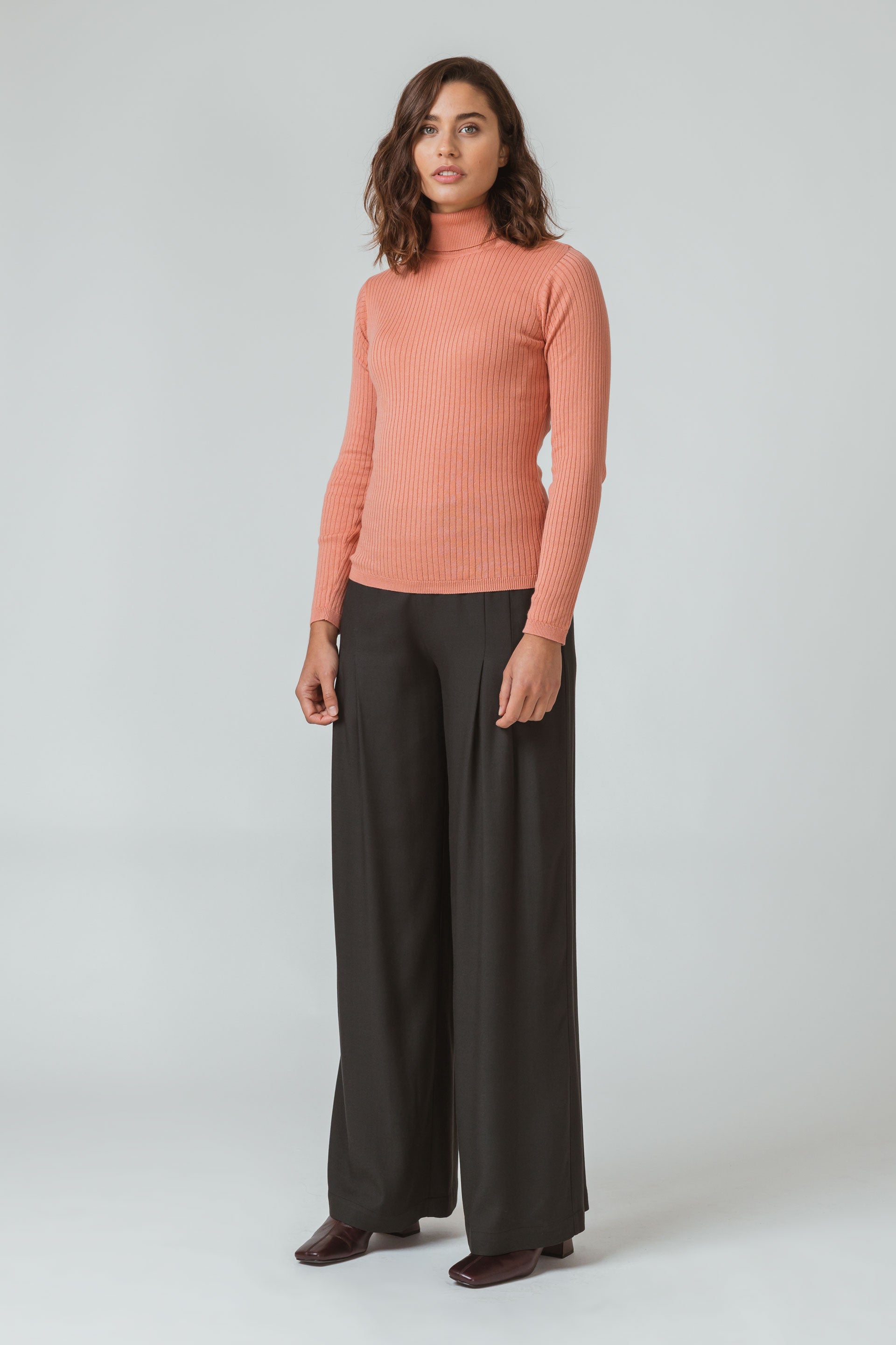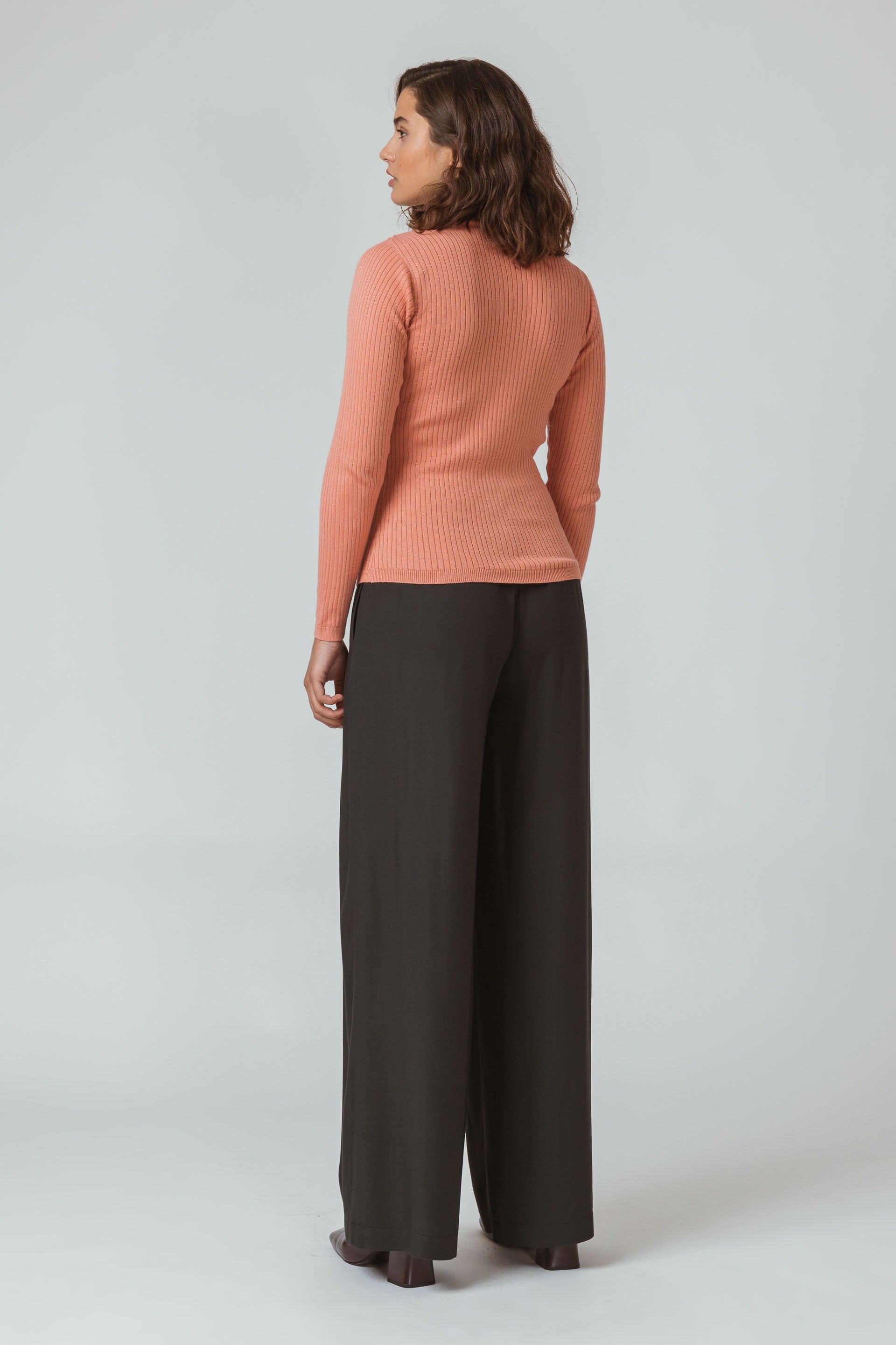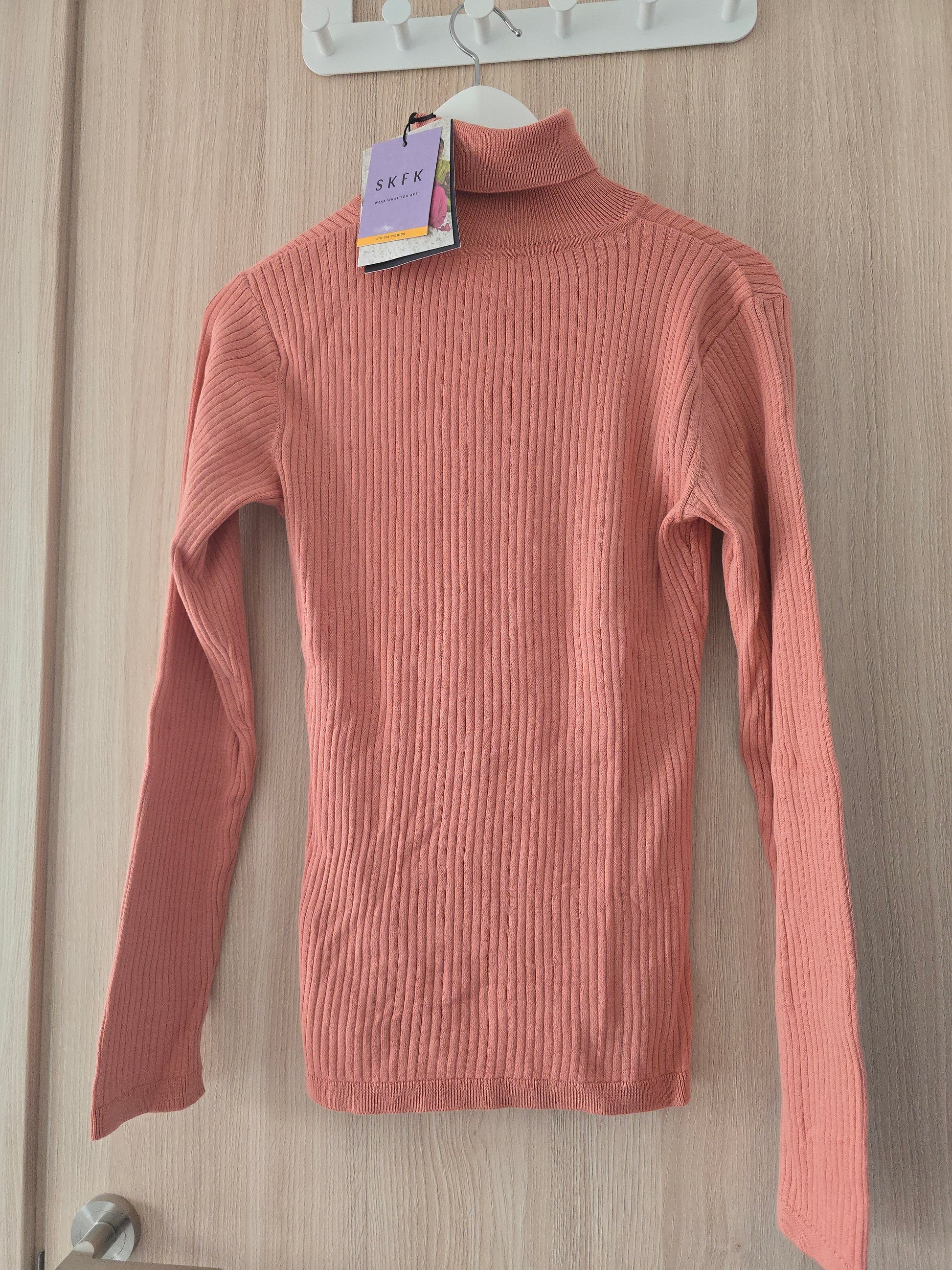 Top de manga larga y cuello alto en punto acanalado de algodón orgánico con certificación GOTS y Fairtrade®. Rosa coral.