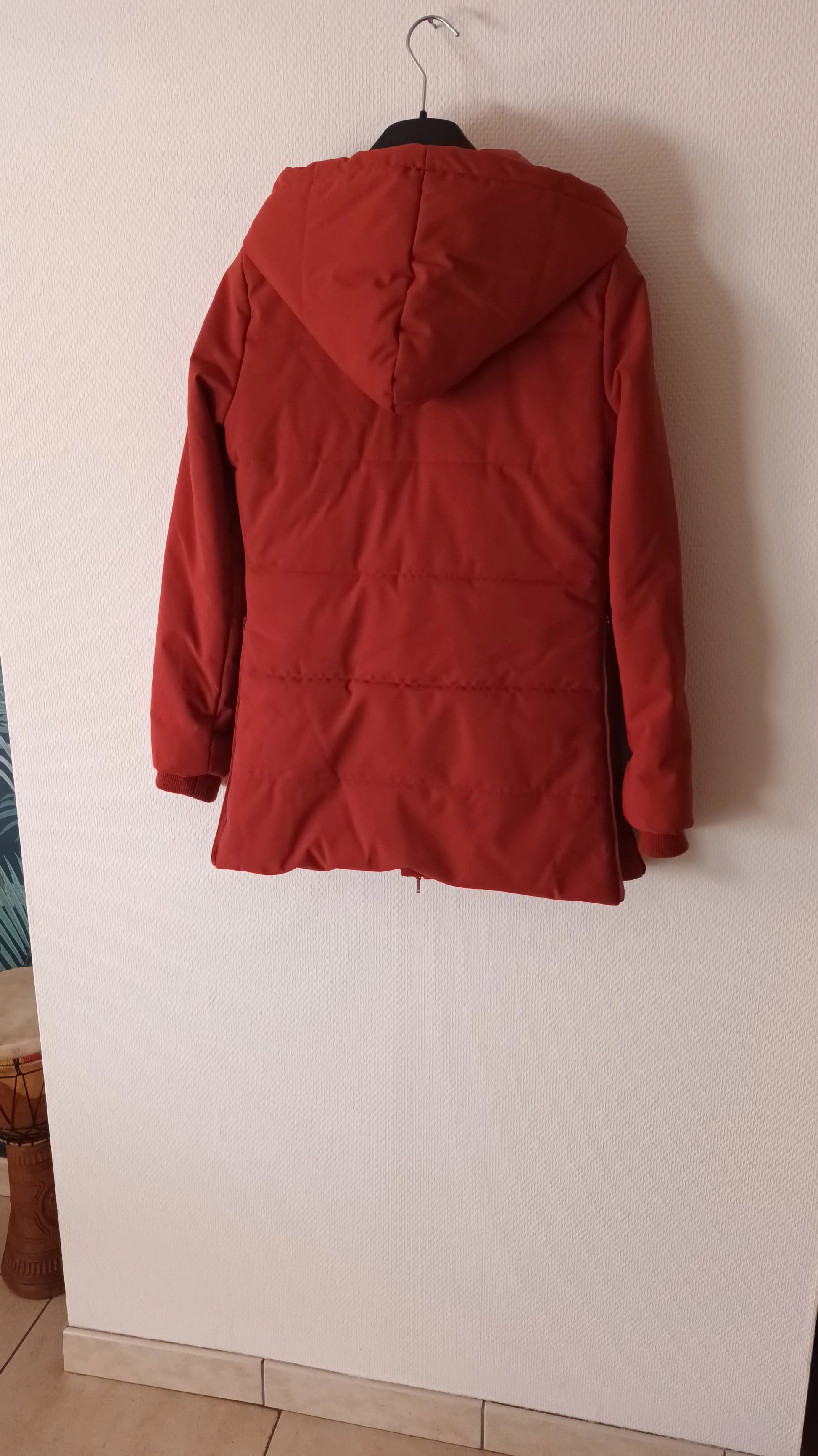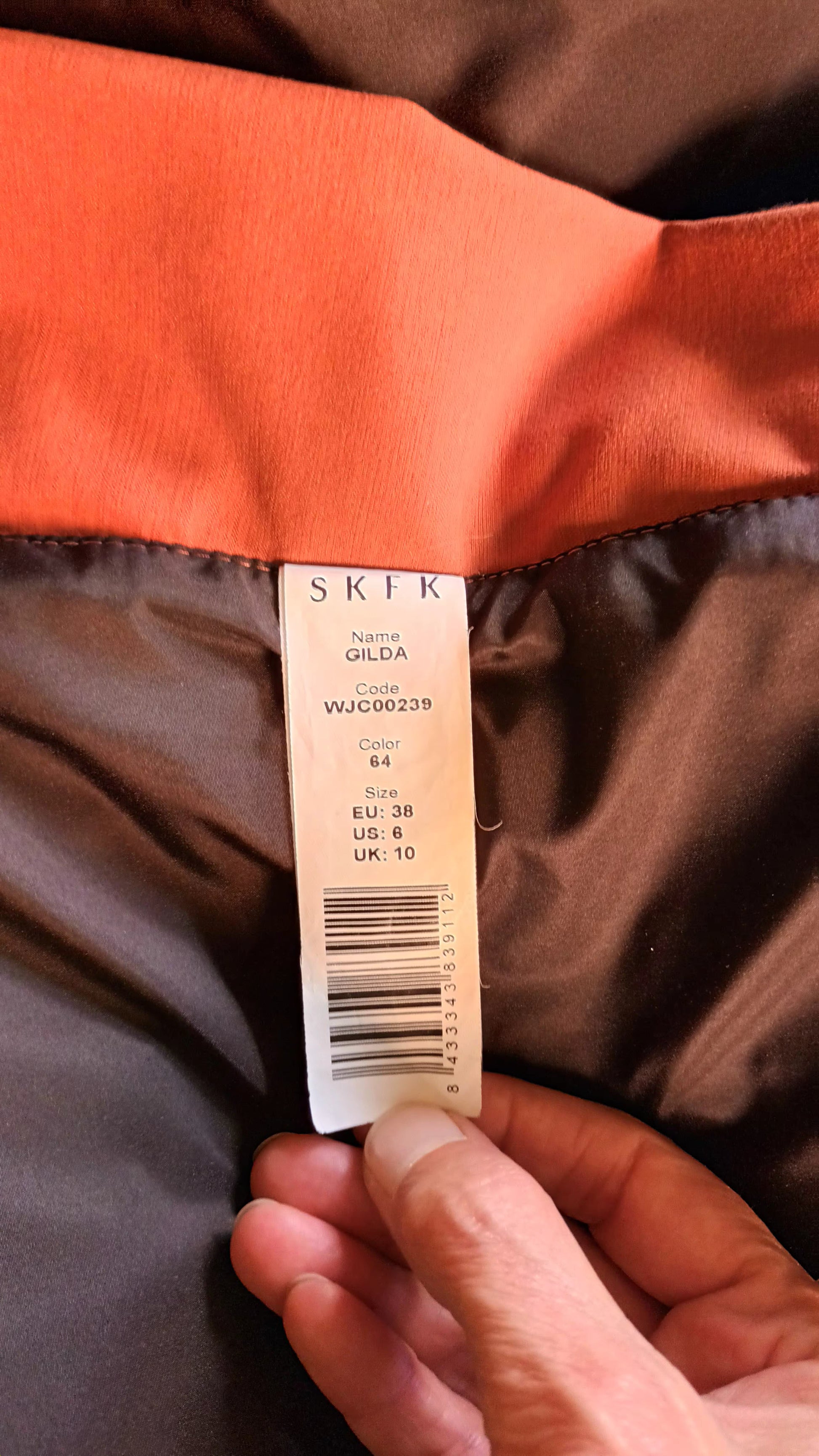 Preciosa chaqueta acolchada en naranja oscuro y ocre, con cremallera en las caderas para mayor libertad de movimiento; lamentablemente, me queda demasiado estrecha. Está en perfecto estado, lavada con mucho cuidado.