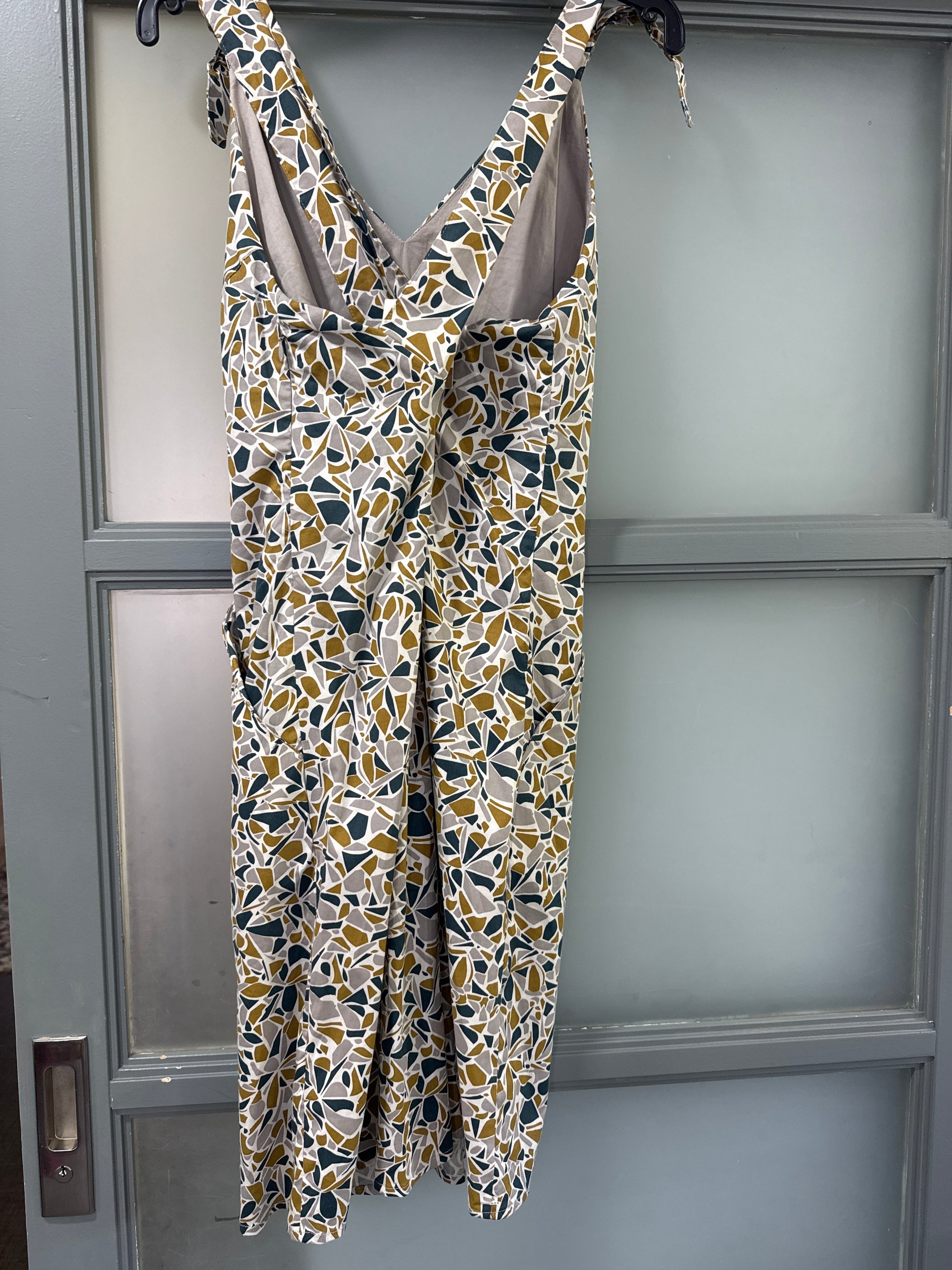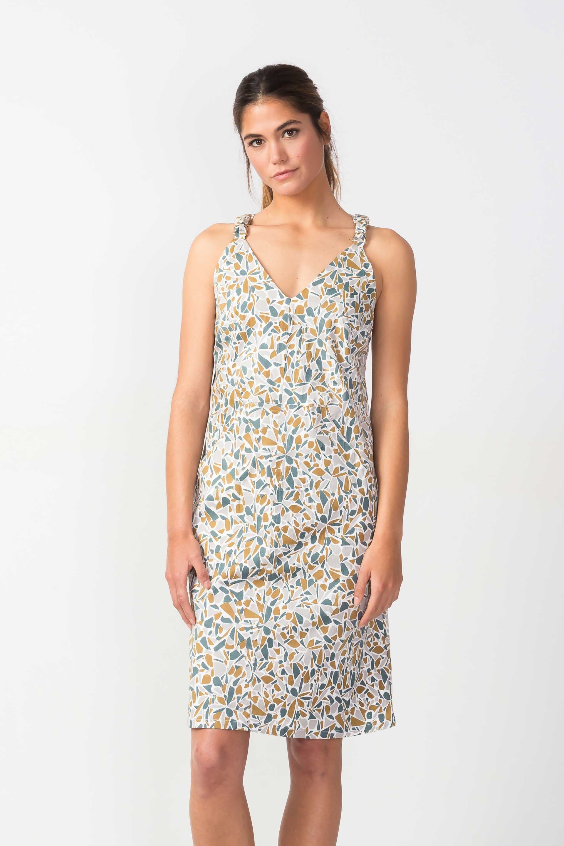 Robe salopette à col V, en coton bio imprimé. Bretelles croisées et poches sur l’avant. Motif inspiré de Calder.