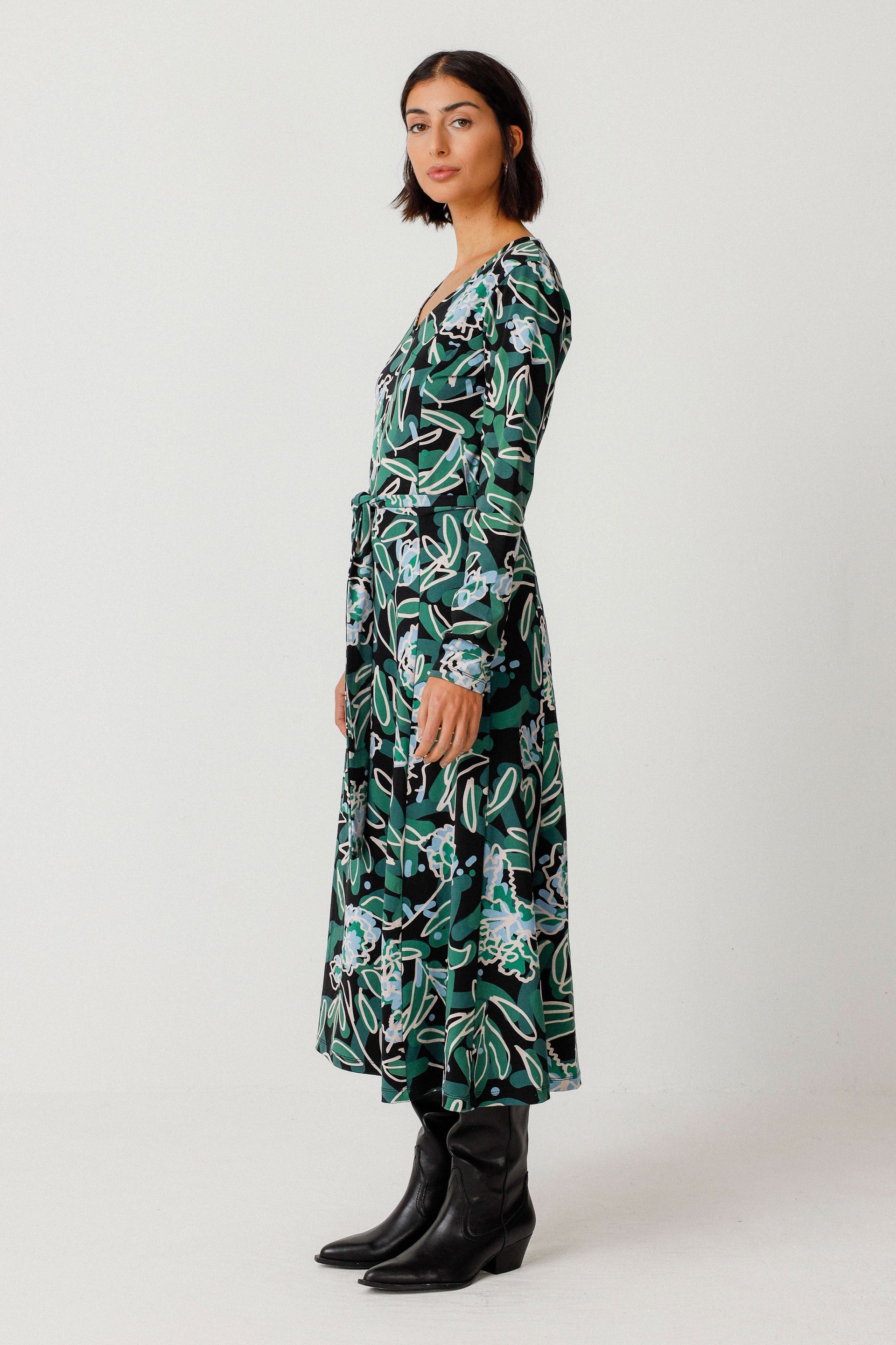 Robe à manches longues évasée avec une taille marquée, un col V et une ceinture amovible. Imprimé floral multicolore.