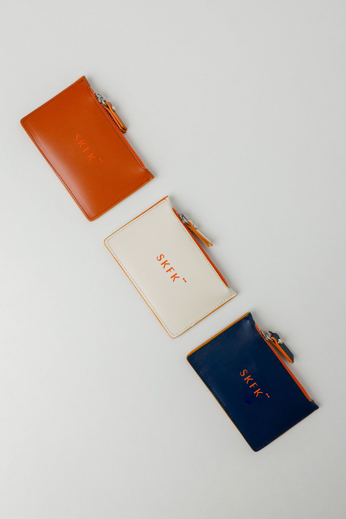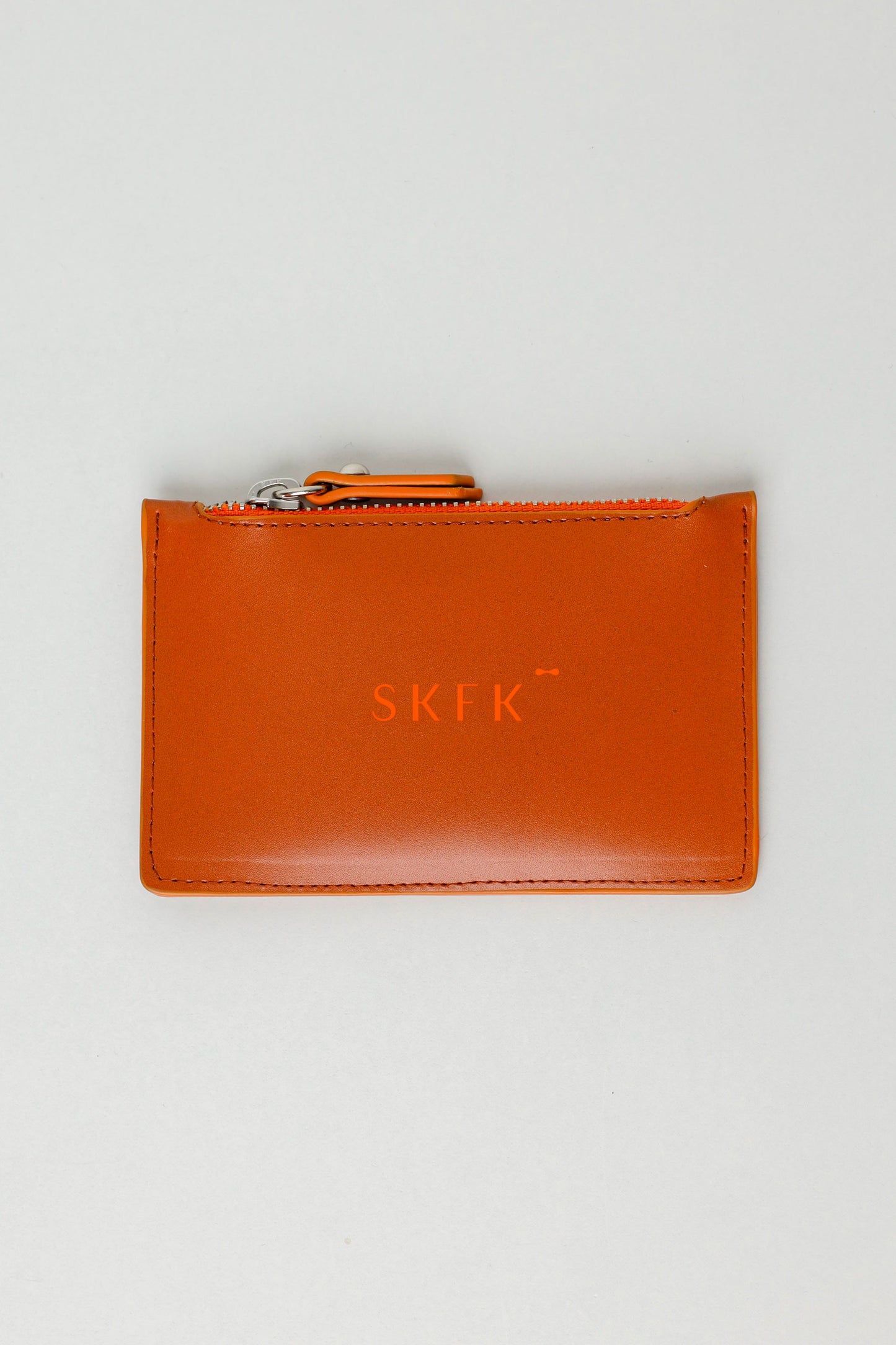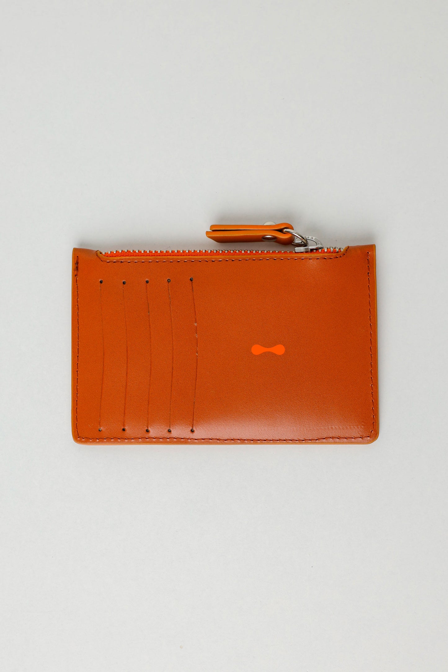 Confectionné en Espagne en cuir recyclé. Porte monnaie avec fermeture zippée et tirette en cuir. Cinq porte-cartes à l’intérieur. Orange. Made in SPAIN