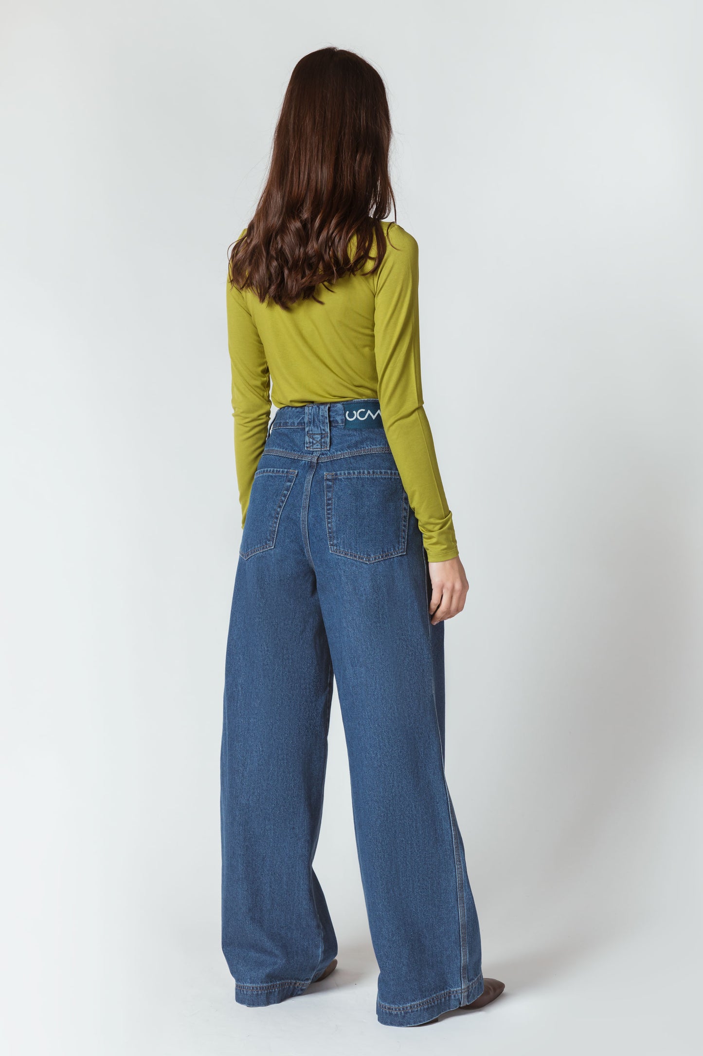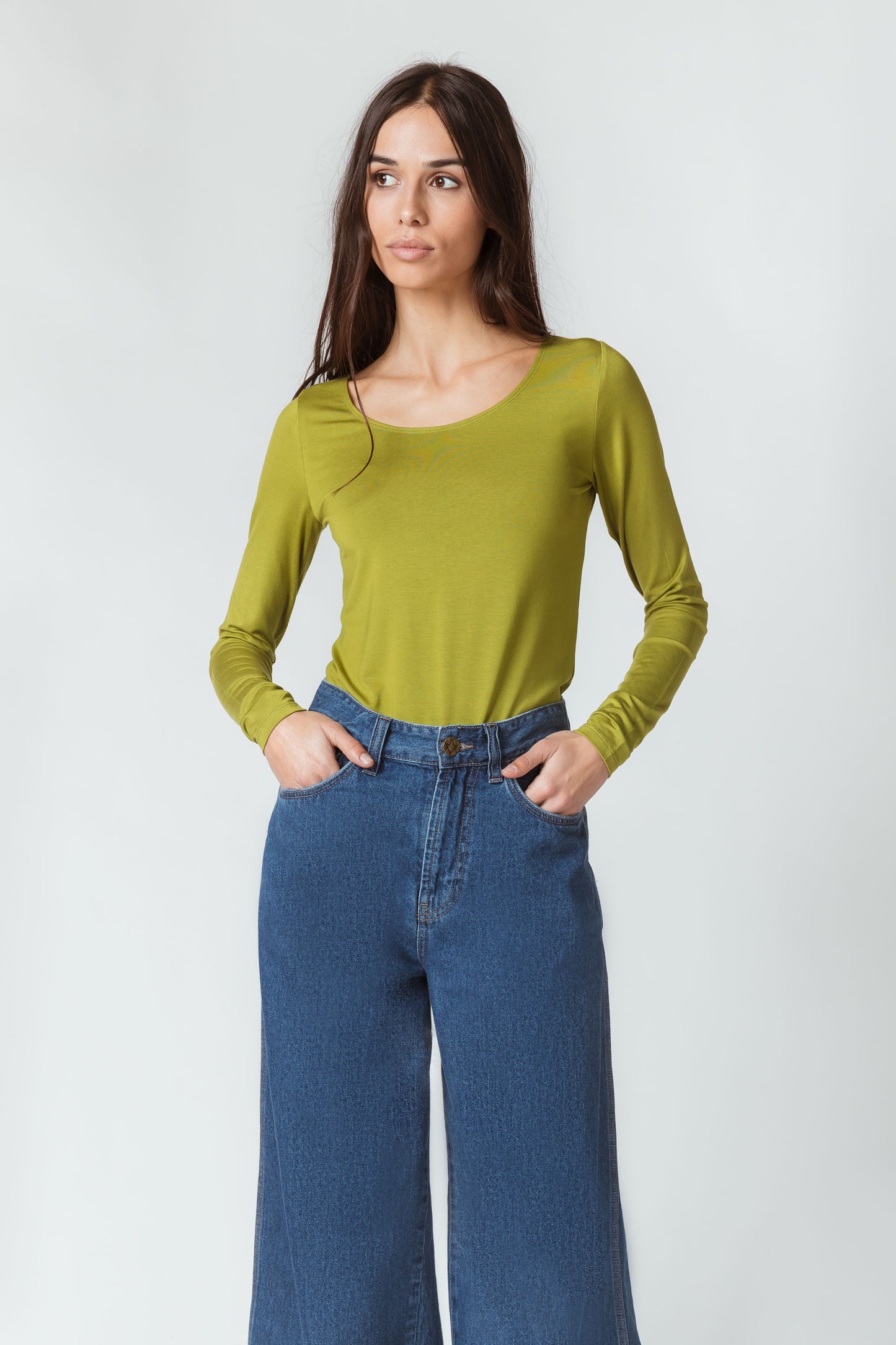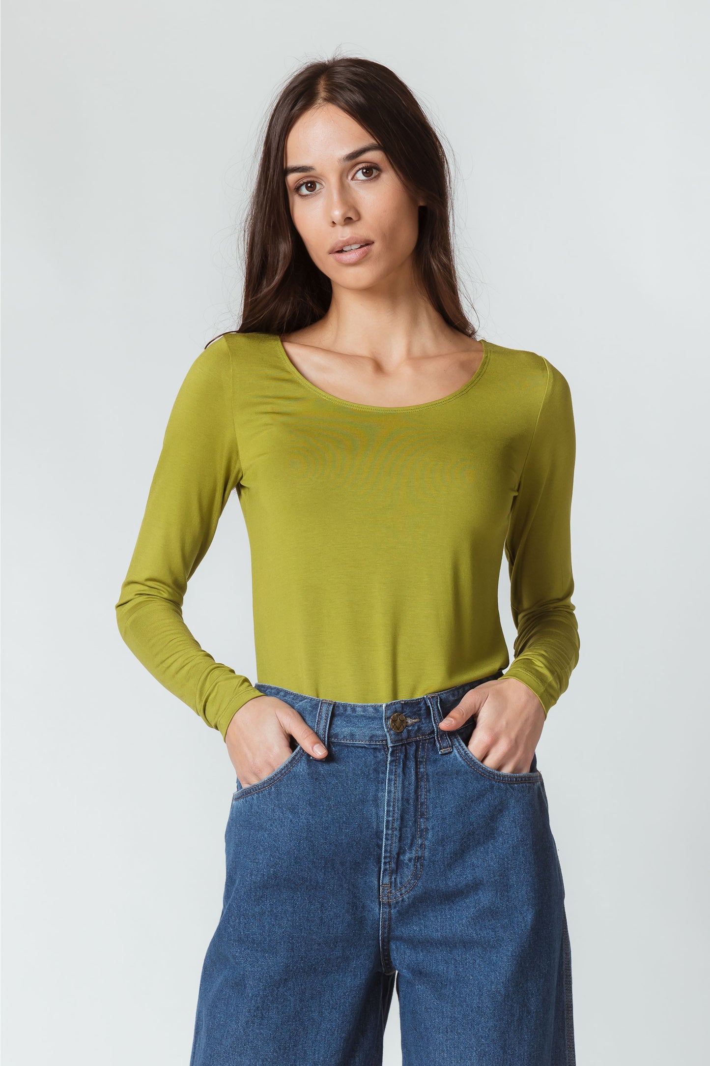 Tee-shirt doux et élastique à manches longues et encolure arrondie. Bleu foncé.