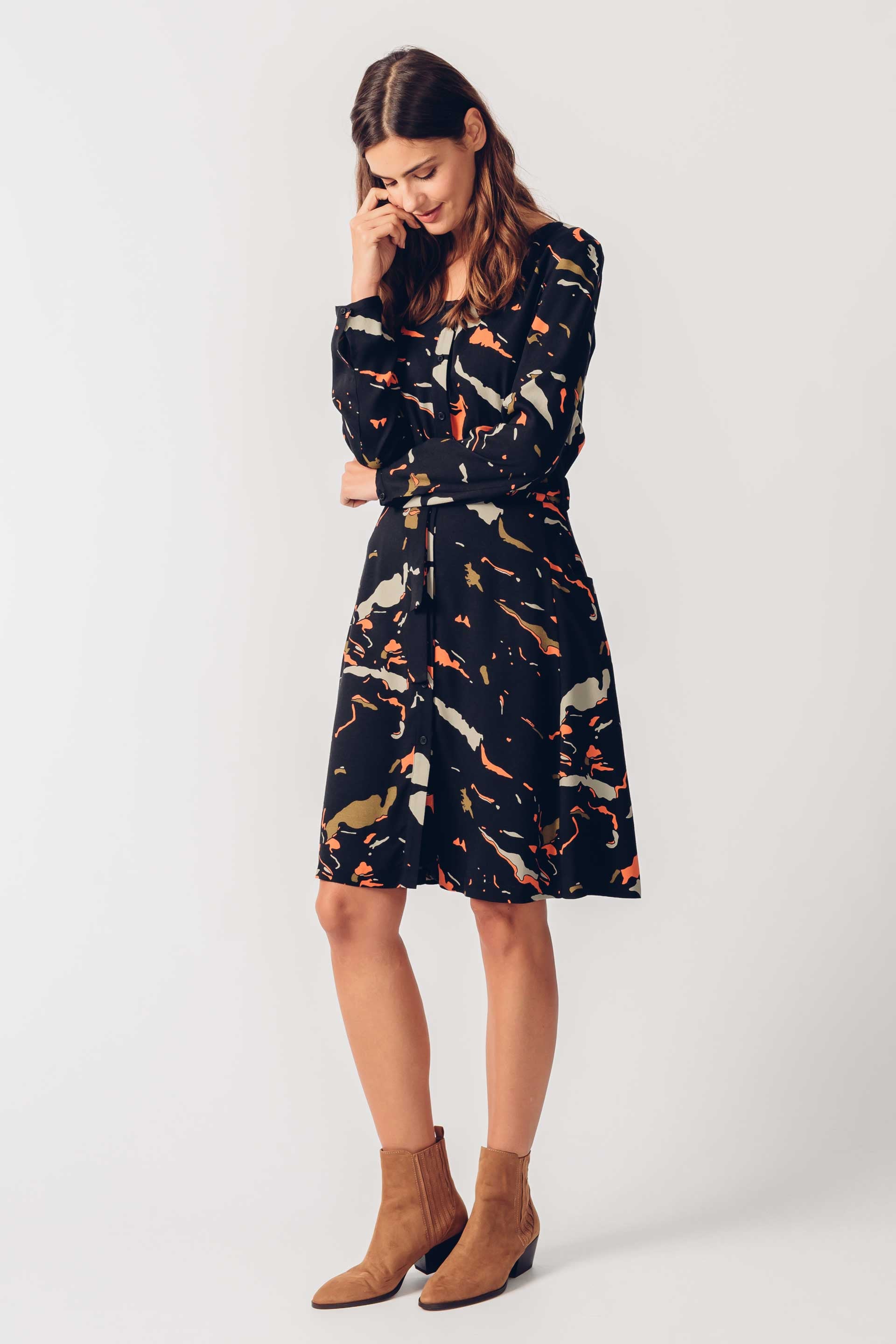Robe imprimée à ceinture dans une matière fluide. Le camo en version chic. Robe féminine avec une jupe évasée et un pli élégant dans le dos, ornée d’un motif camouflage inspiré de l’univers géologique.