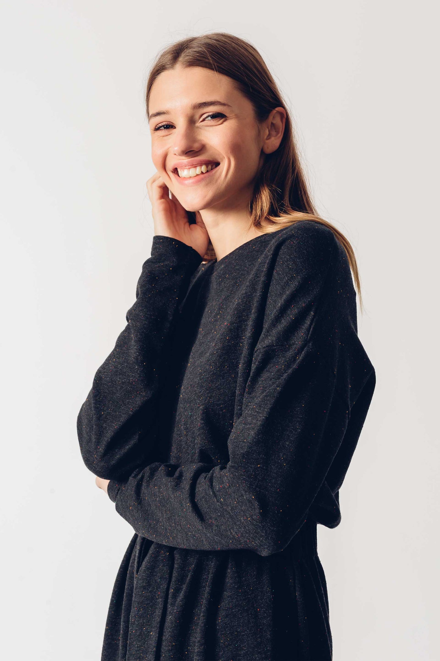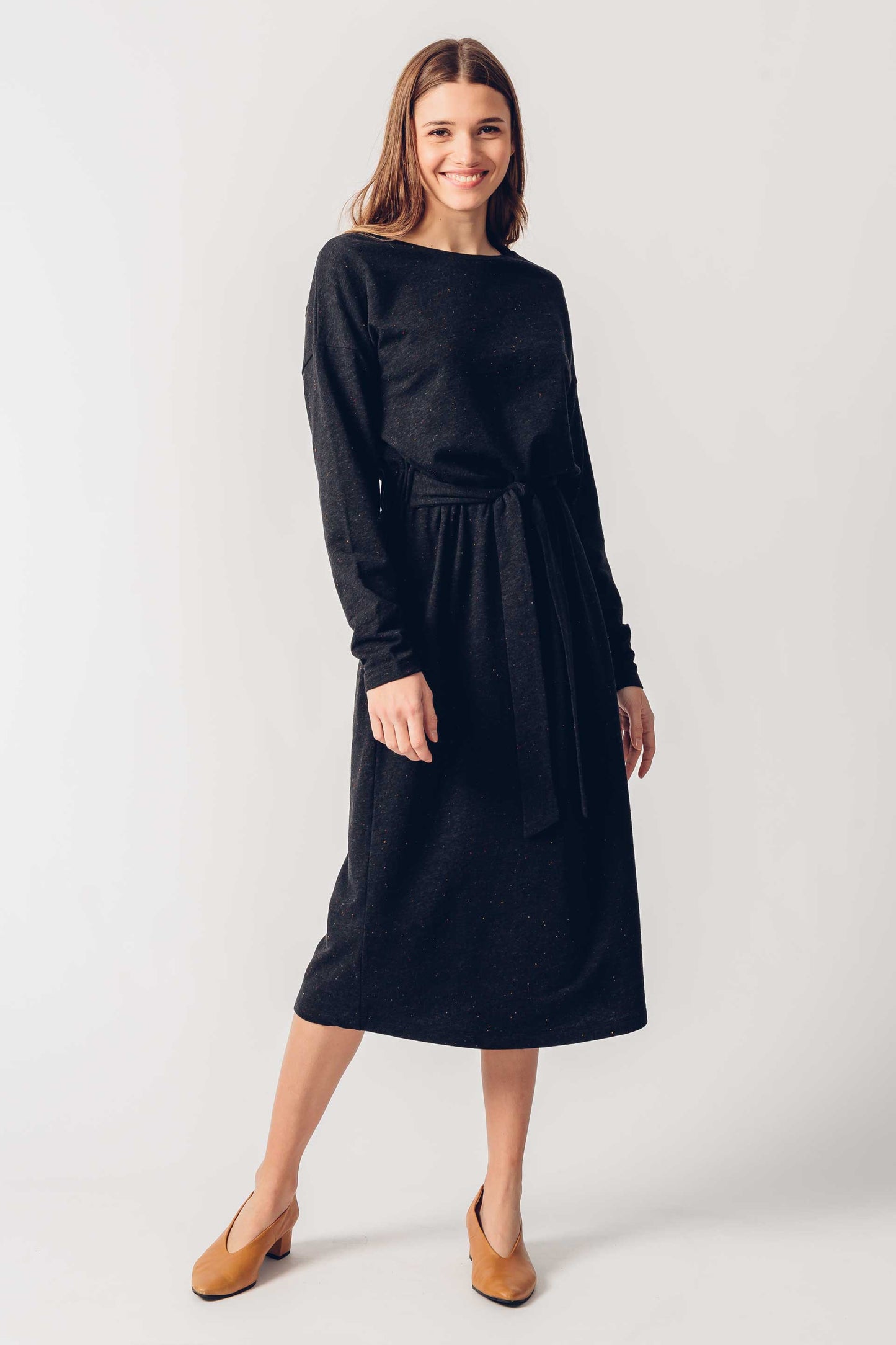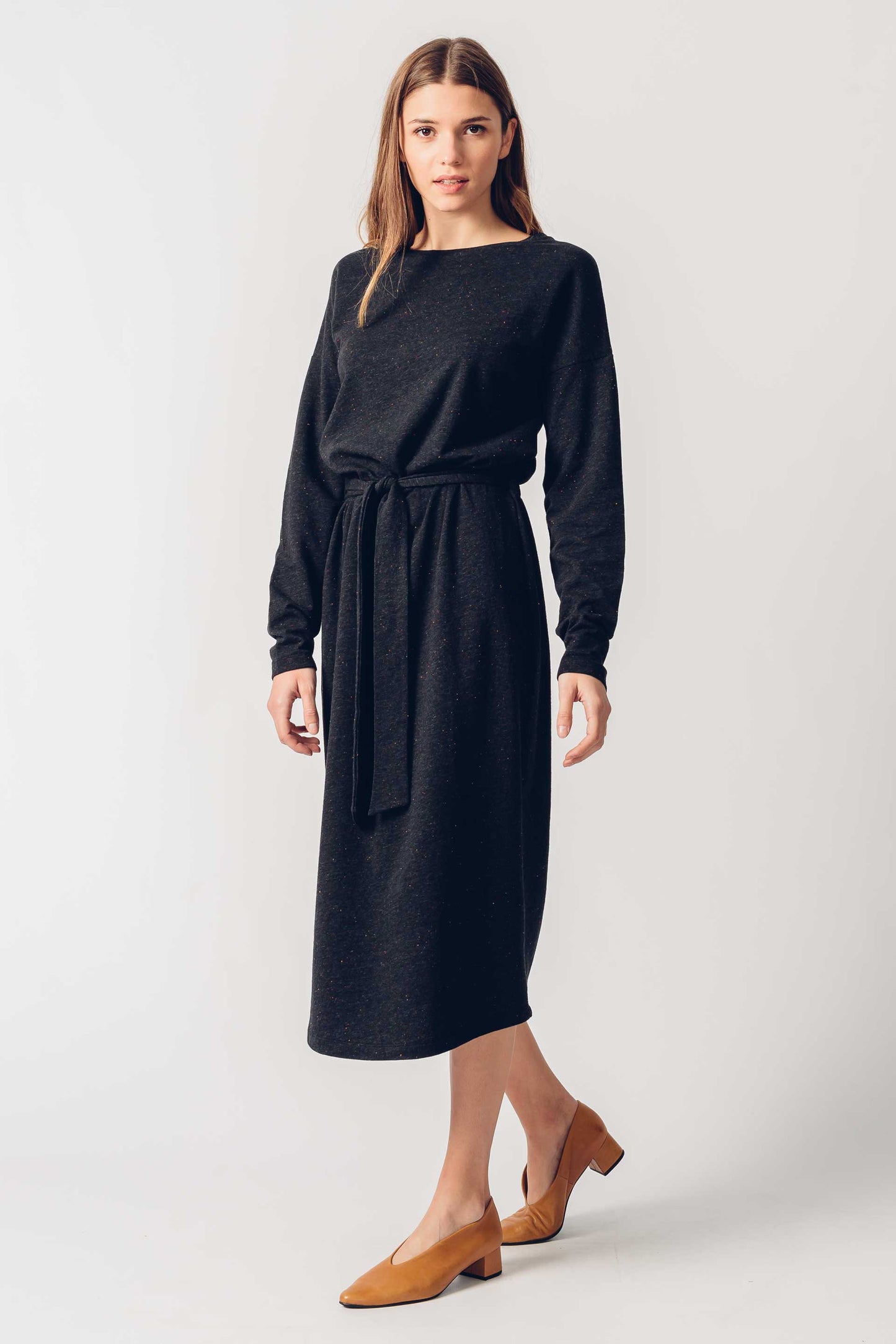Robe longue stretch confortable. Chouchoutez-vous. Avec des points colorés discrets et une ceinture mettant en valeur votre taille, cette robe confortable est idéale lorsque vous la personnalisez avec vos accessoires favoris.