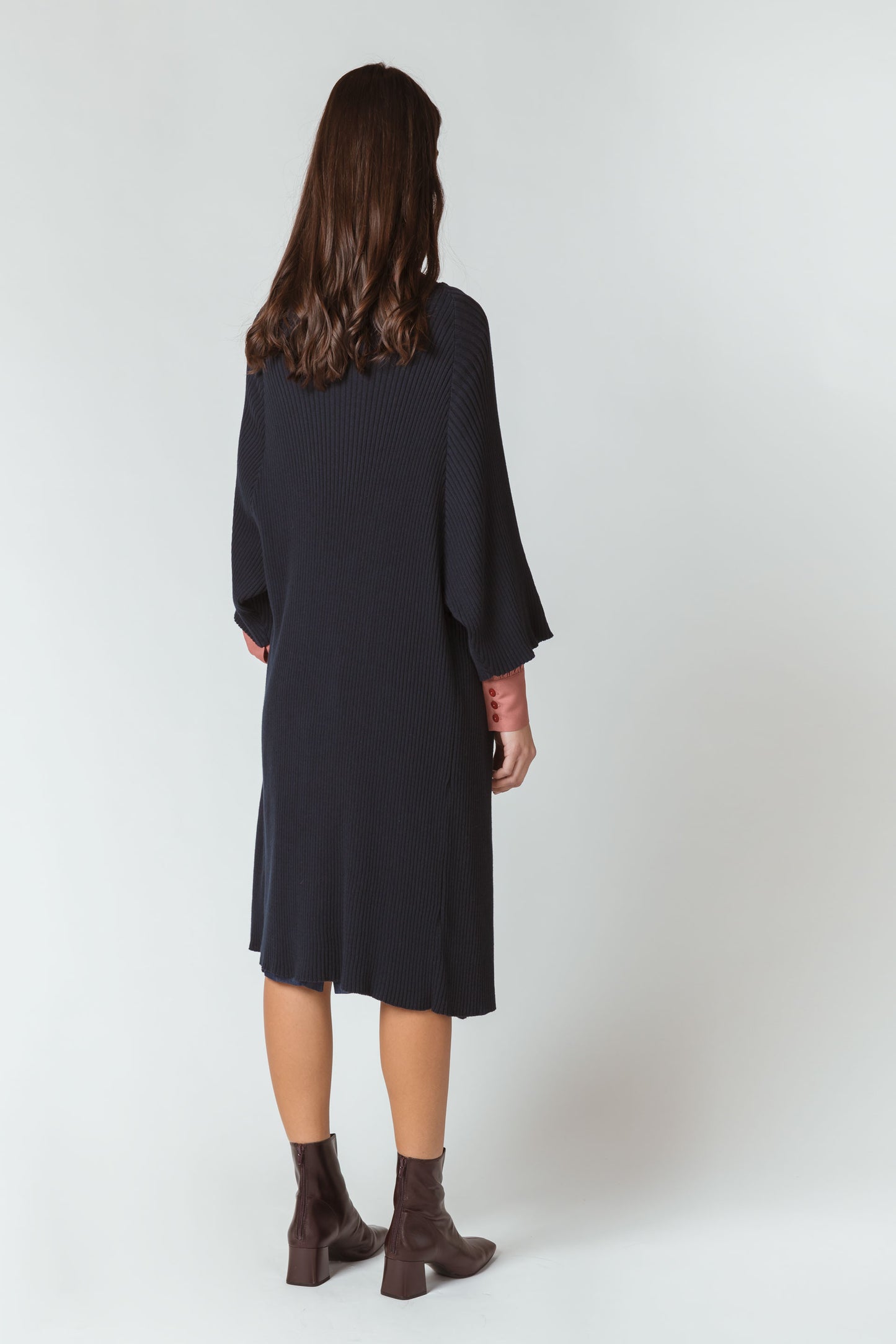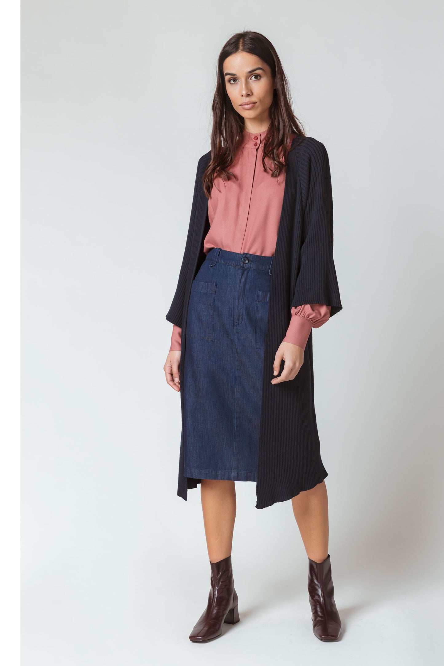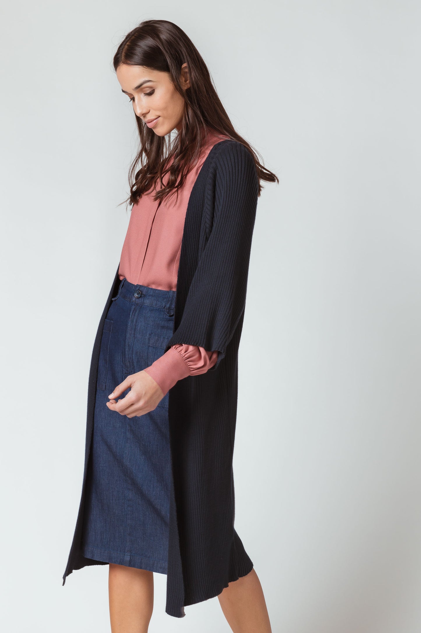 Long cardigan ouvert à manches courtes, avec détails en tricot à côte. Bleu foncé.