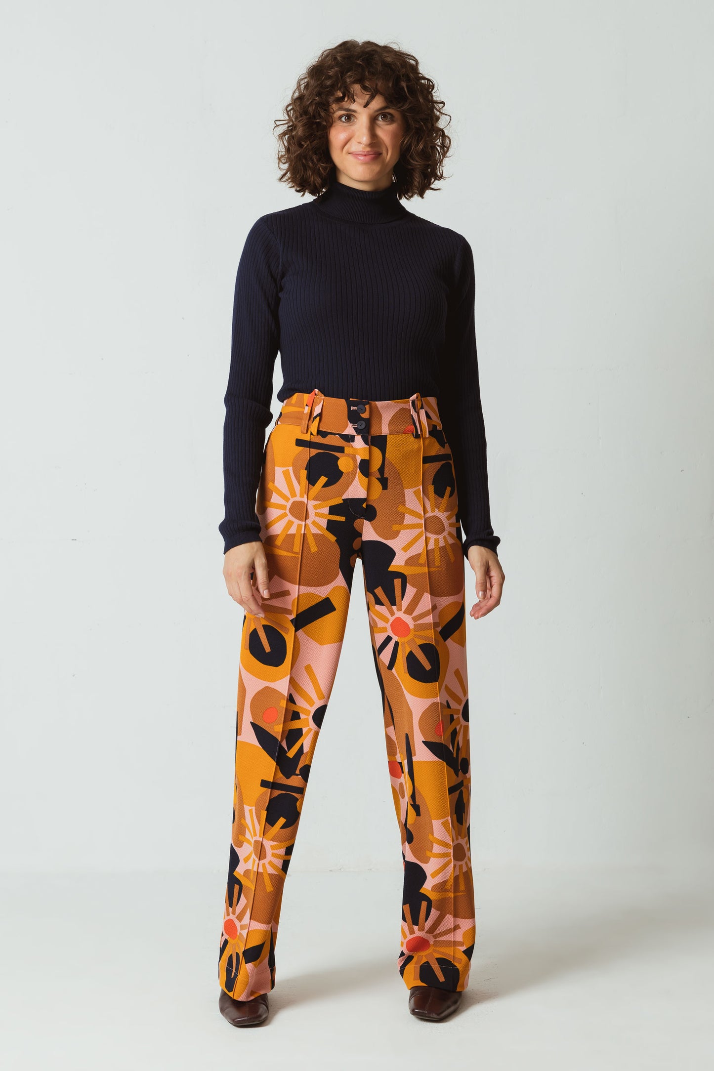 Pantalon droit en polyester recyclé stretch avec une coupe ample, un pli sur le devant de la jambe, des passants de ceinture et des poches pour les mains. Imprimé multicolore dans des tons roses.