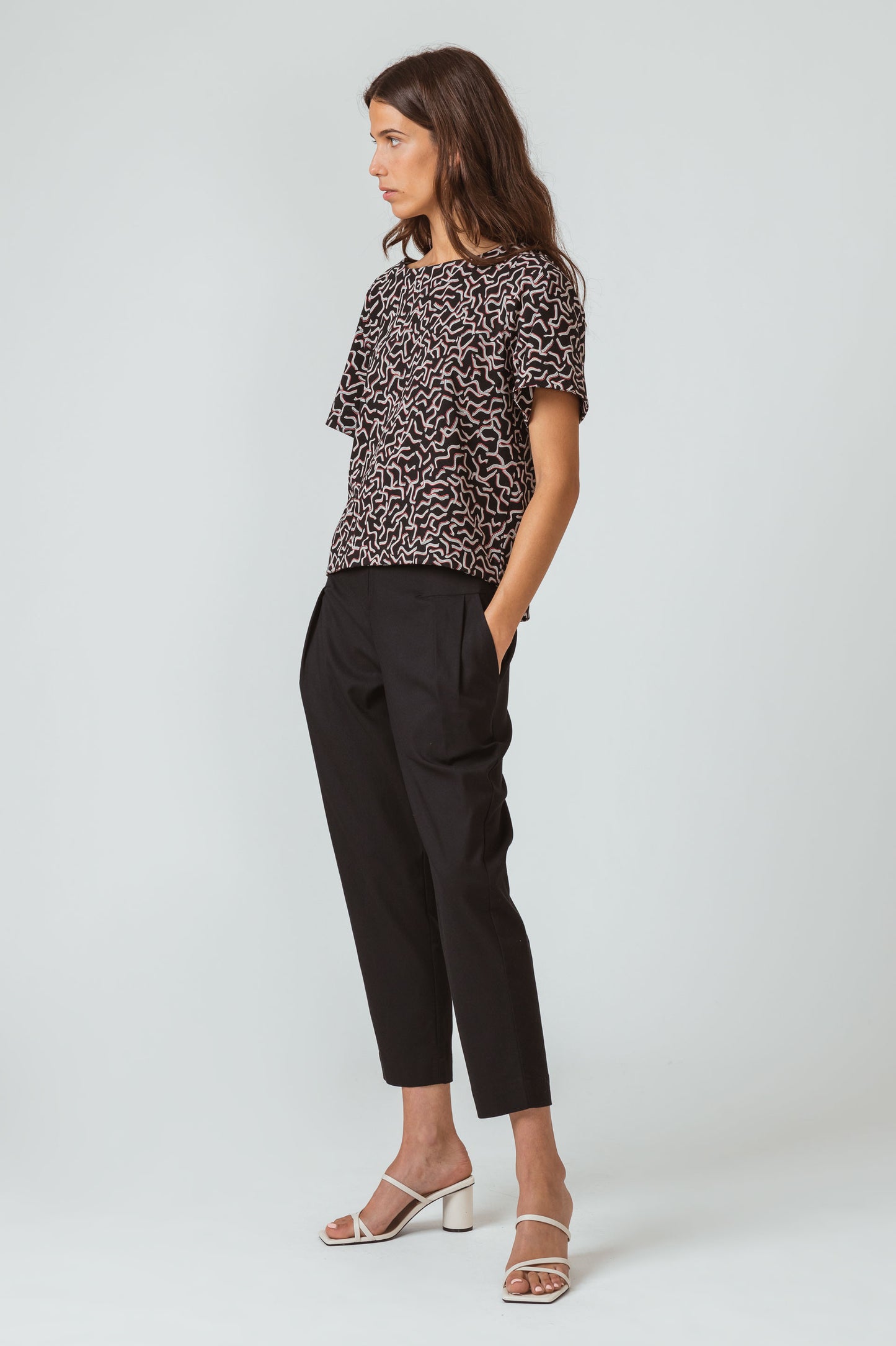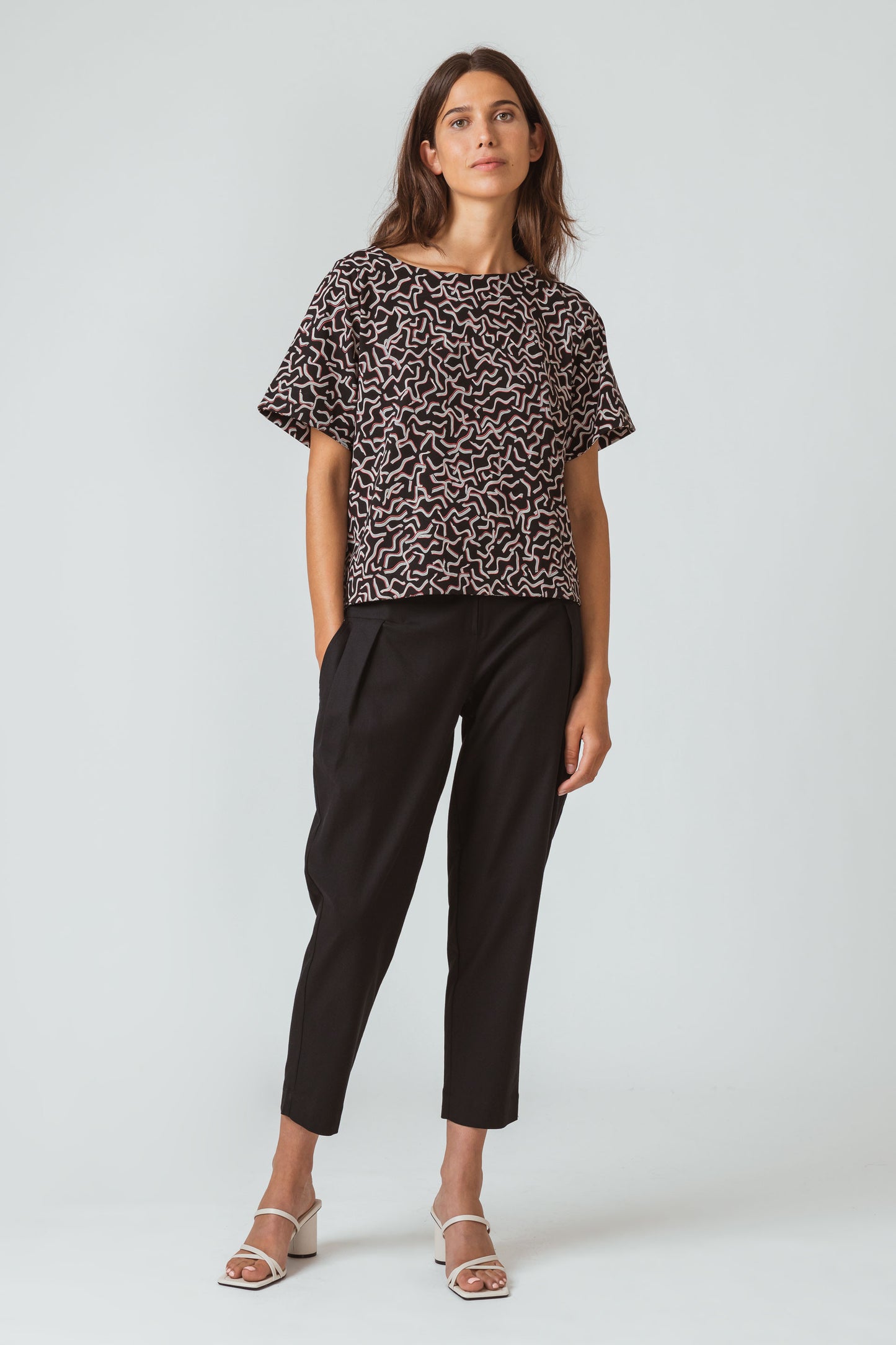 Ample T-shirt à manches courtes et col rond, en coton bio stretch. Imprimé géométrique sur fond noir.